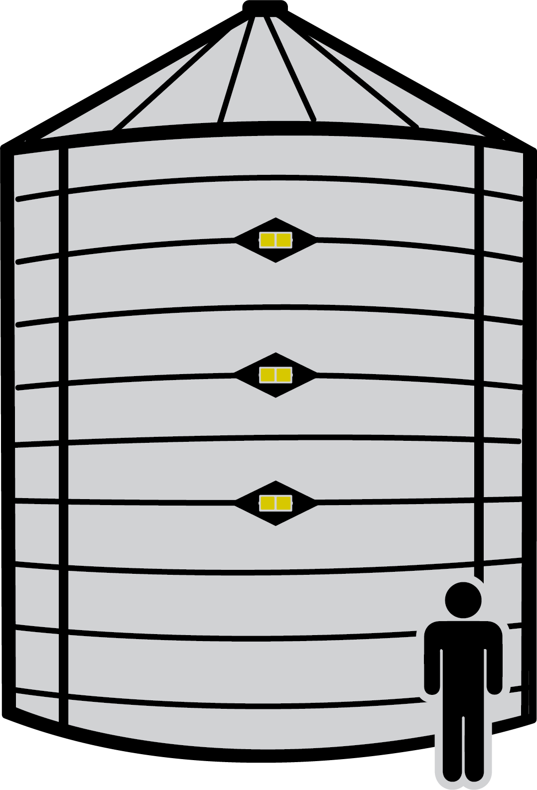 Without the use of grain gauges, farmers are required to climb ladders or stairs to visually inspect grain bin levels. Unfortunately falls are common. Grain gauges keep farmers' feet on the ground and safe from falls. Farmers can look up and see if the granular material in the bin is above or below the installed grain gauges.